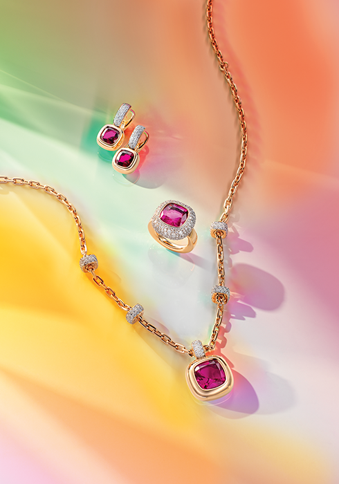 브랜드 고유 기술력인 누도 커팅을 적용했다. 좌우 각각 3캐럿의 루벨라이트와 총 25개의 다이아몬드를 촘촘히 세팅한 누도 하이 주얼리 컬렉션 이어링, 핑크빛 원석의 영롱함을 강조하기 위해 6.75캐럿의 루벨라이트를 중심으로 2백28개의 화이트 다이아몬드를 파베 세팅한 로즈 골드 누도 하이 주얼리 컬렉션 링, 큼직한 10.5캐럿의 루벨라이트 펜던트가 시선을 사로잡으며, 체인 링크에 일정한 간격으로 총 2.55캐럿의 다이아몬드 2백38개를 세팅해 볼드하게 완성한 로즈 골드 누도 하이 주얼리 컬렉션 네크리스 모두 가격 미정 포멜라토. 문의 031-5170-2168