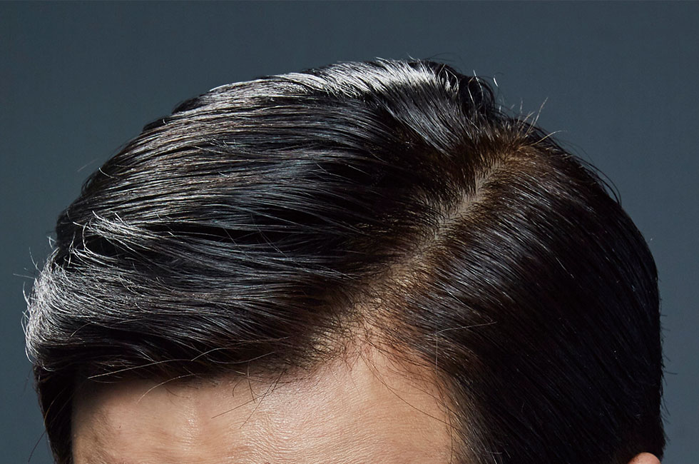 가발 소재 사이의 봉제선이 없는 무봉제 기술로 두피의 자연스러운 느낌을 극대화한 탑 시크릿의 가르마 부분.