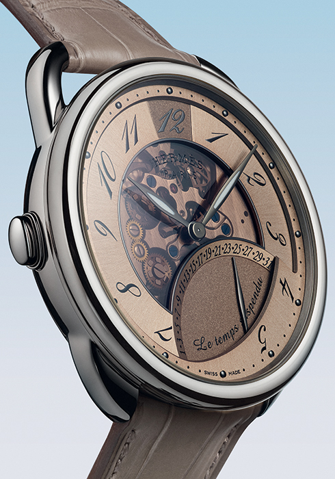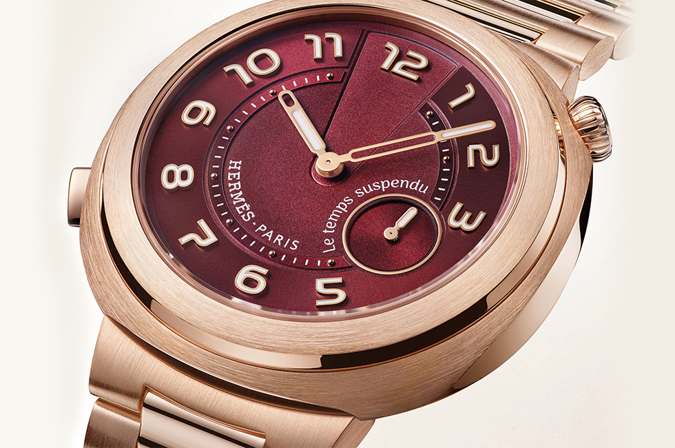 5 에르메스 컷 르 땅 서스팡뒤 중 시즌 한정 제품으로 선버스트 레드 다이얼을 매치한 로즈 골드 버전.