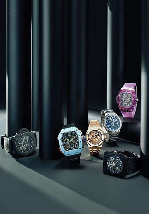 소재를 자유자재로 다루는 브랜드만의 노하우로 빚어낸 투명한 퍼플 컬러 사파이어와 스켈레톤의 특징을 조화롭게 구성한 피스. HUB6020 매뉴팩처 매뉴얼-와인딩 파워 리저브 스켈레톤 투르비용 무브먼트의 신비로운 움직임을 감상할 수 있다. 3억3천만원대. 문의 02-3213-2277