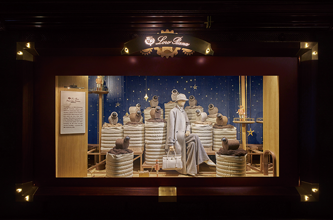 4 로로피아나 최고의 섬유와 관련된 장소와 커뮤니티를 배경으로 경이로운 이야기를 엮어낸 해러즈의 윈도 디스플레이.