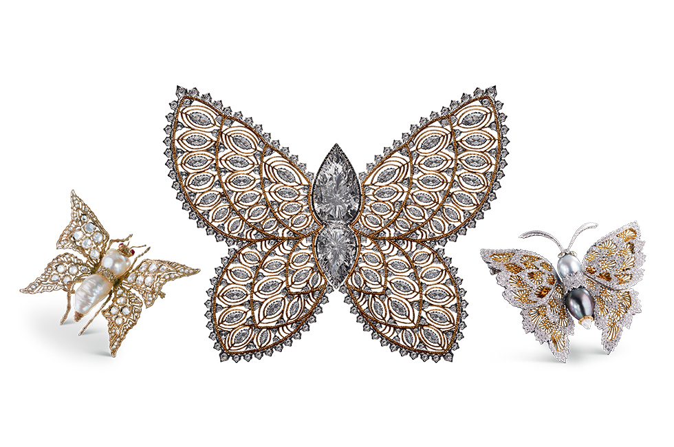 1.© Aplomb Photo Studio, MARIO BUCCELLATI 1950년 부첼라티 히스토릭 컬렉션의 나비 브로치. 화이트 골드, 바로크 진주, 루비, 다이아몬드로 이뤄졌다. © Aplomb Photo Studio, ANDREA ET LUCREZIA BUCCELLATI 2023년 유니카 컬렉션. 옐로 골드, 화이트 골드, 다이아몬드로 이루어진 나비 브로치.