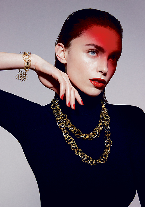 4. © Alvaro Beamud Cortes 다이아몬드가 세팅된 옐로 골드와 화이트 골드 소재의 하와이 컬렉션 주얼리를 착용하고 있는 모델 찰리 위즈(Charlie Weiss).