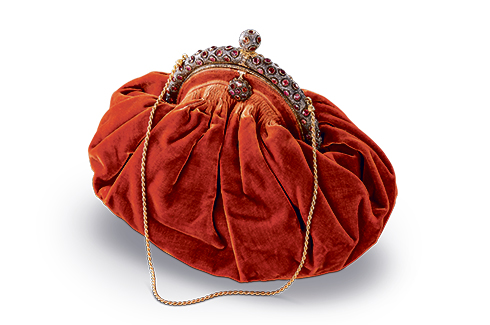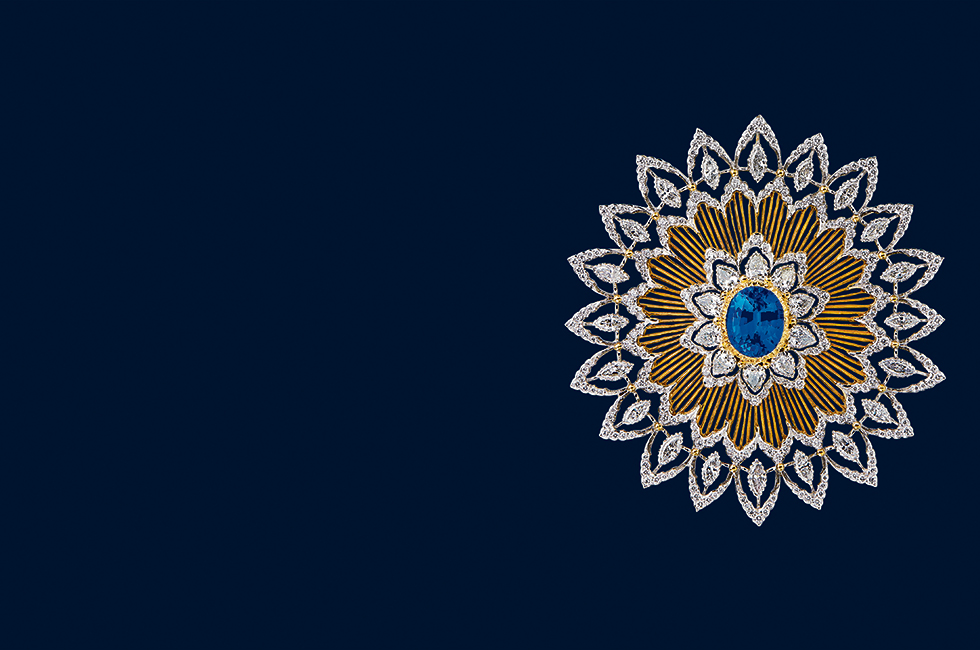 6. © Aplomb Photo Studio 사파이어와 다이아몬드를 세팅한 옐로 골드와 화이트 골드의 2017년 유니카 펜던트 브로치. © Aplomb Photo Studio, MARIO BUCCELLATI 1920년대 부첼라티 히스토릭 컬렉션으로 벨벳과 실크 소재의 이브닝 백. 버클을 투르말린과 실버 및 옐로 골드로 장식했다.