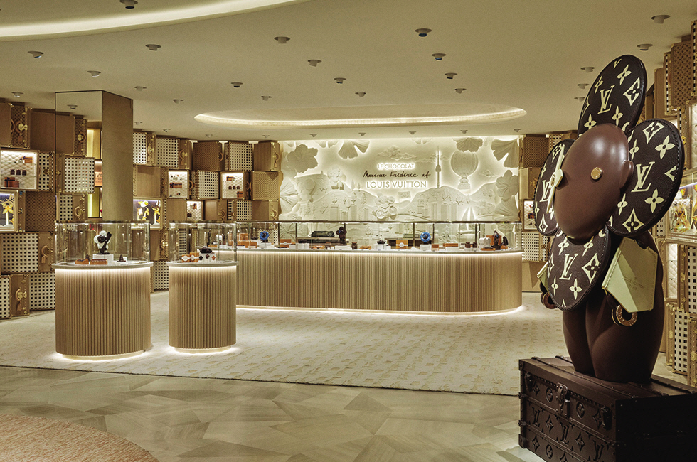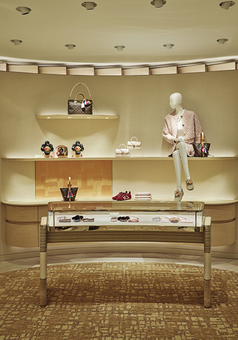 각 층은 단순한 쇼핑 공간을 넘어, 루이 비통이 이해하는 ‘문화적 여행’을 감각적으로 체험하는 장소로 기획됐다. 1층 여성 레더 굿즈, 뷰티, 액세서리 그리고 워치&주얼리 공간에서 시작해 2층에서는 여성 레더 제품과 레디투웨어, 슈즈 컬렉션을 선보이며, 3층에서는 남성 레디투웨어, 트래블 그리고 액세서리 등을 전개한다. 2층과 3층 사이에는 이현정 작가의 작품 ‘Contemplation’을 설치해 시간, 기억, 정체성을 탐구하며 공간의 정서를 한층 더 깊이 있게 느끼도록 이끈다. 4층부터는 루이 비통이 전개하는 확장된 라이프스타일을 온몸으로 느낄 수 있는 공간으로 구성했다. 4층에는 루이 비통 기프트와 홈 컬렉션, 그리고 ‘르 카페 루이 비통’과 파리, 뉴욕, 싱가포르, 그리고 한국 등 전 세계 단 네 곳에서만 경험할 수 있는 ‘르 쇼콜라 막심 프레데릭 앳 루이 비통’이 자리한다. 5층에서 4층으로 이어지는 공간에는 루이 비통의 역사를 온몸으로 체험할 수 있는 문화 체험형 공간이 자리하며, 마지막 6층에서는 루이 비통 레스토랑 ‘제이피 앳 루이 비통’까지 만나볼 수 있다.