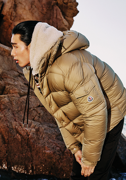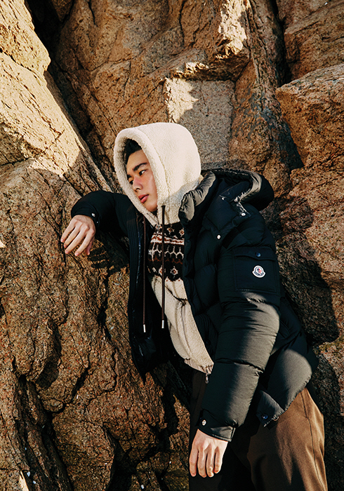 로고 포켓과 탈착 가능한 후드를 겸비한 블랙 컬러의 마야 70 재킷, 부클레 소재의 후드 집업, 브라운 팬츠 모두 가격 미정 몽클레르 컬렉션.