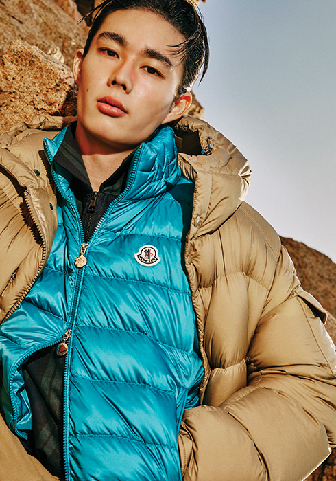 코쿤 실루엣이 특징인 베이지 컬러 브레타네 재킷, 블루 컬러의 다운 베스트, 집업 셔츠 모두 가격 미정 몽클레르 컬렉션.