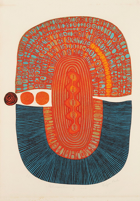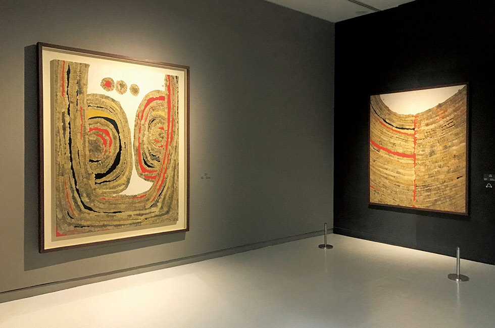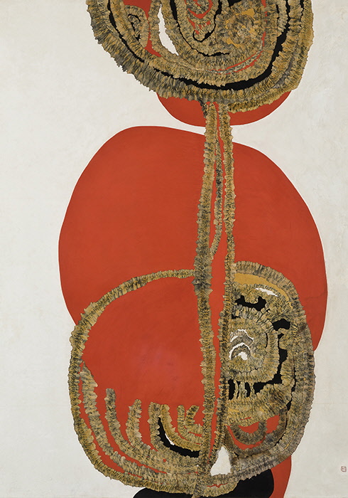 이번 전시의 포스터와 도록 표지를 수놓은 ‘띠 초상’ 작품들은 독자성을 드러내면서도 그 같은 ‘근원’을 향한 탐구적인 일관성을 품고 있다. 당시에는 이채로운, 그래서 낯설게도 느껴졌을 법한 색상이나 무늬의 조합은 골똘히 보노라면 탯줄 같기도 한, 생명성을 품고 있는 듯 보인다(“태양의 생동감을 황색 빛으로, 살아 있는 인간의 생명을 붉은 피로, 시대에 대한 고민을 검은 침묵으로 표현했다”는 ‘띠 추상’에 대한 그녀의 설명도 있다). 그러고 보면 ‘새’나 ‘기도’ 같은 1950년대 작품이나 1970년대 작업에도 ‘생명의 원류’를 다루는 그녀의 관심사가 일관성 있게 나타난다.