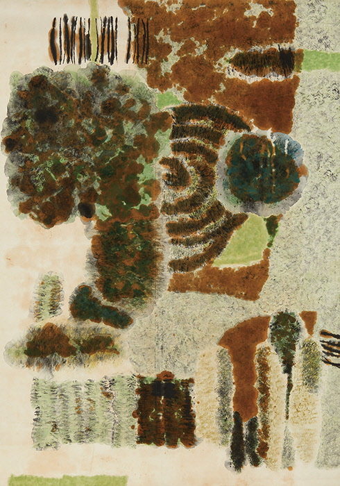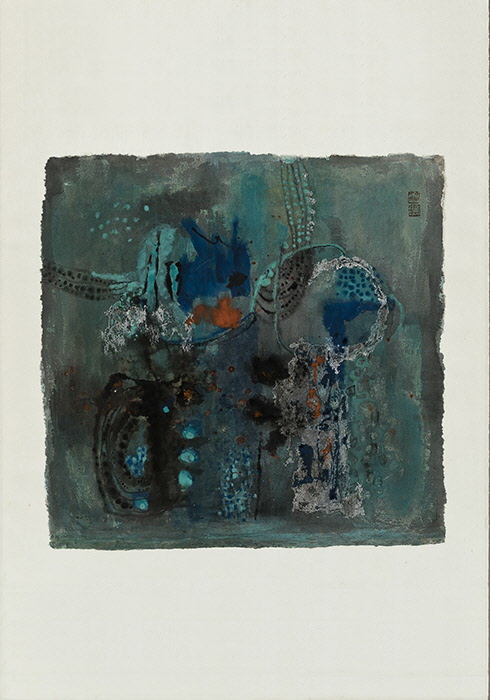 1960년 박래현은 해방 뒤 처음으로 바다 건너 해외 문물을 직접 접한다. 대만, 홍콩, 일본 등지를 돌면서 추상화의 물결을 온몸으로 느낀 그녀는 본격적으로 ‘추상’에 돌입한다. 이 역시 조형 정신을 그대로 수용했다기보다는 한 양식으로 받아들여 안료나 재료 등을 다양하게 쓰면서 동양화로 풀어낸다. “예민한 동양의 피부랄까. 화선지에 스며가는 먹이 보여주는 아름다운 색조의 변화는 언제 어느 곳에서나 조용한 동양의 멋을 자아내는 우리만이 지닐 수 있는 아름다움이라고 본다.” 직접 남긴 글처럼 그녀는 동양화의 섬세함을 사랑했다. ‘잊혀진 역사 중에서’라는 단일한 제목을 지닌 11점 시리즈는 1960년대 초중반기의 추상 대표작. 장엄한 이 제목을 보고 전시 큐레이팅을 맡은 김예진 학예연구사는 “처음에는 뭔가 있어 보여서 가져다 썼나 싶었는데, 박래현의 작품을 계속 관찰하다 보니 추상, 판화 등으로 이어지면서 결국에는 하나의 초점으로 연결되는 것 같다”고 설명한다. “결국 ‘시간’인 것 같아요. 인류의 근원, 오래된 역사, 오래된 자연 등에 관련된 이미지가 거듭 반복되는데, 그것에 대한 단초를 보여주는 게 바로 이 시리즈가 아닐지. 동양적인 것, 오래된 것, 장구한 것들 같은 걸 연상하면서 작업한 게 아닐까….”