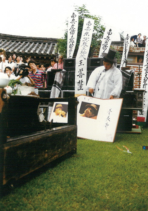 현대미술에는 2명의 원조 샤먼이 있다. 요제프 보이스와 백남준이다. 샤먼은 의사의 원형이다. 무당은 치병과 유희적 기능이 중요한 존재이며, 죽음(신령, 영혼/죽은 토끼, TV스크린 등)을 통해 산 자를 치유한다는 역설을 실천한다. 요제프 보이스가 조용히 앉아 많은 것을 사유케 하는 회색빛 샤먼이라면, 백남준은 혼란스러운 색을 동원하며 끊임없이 움직이는 ‘디지털 샤먼’이다. 보이스는 모든 통과의례를 거치며 온갖 노력 끝에 샤먼을 후천적으로 획득한 ‘강신무’라면, 백남준은 어릴 때부터 굿을 자주 접해 자연스럽게 무당이 된 ‘세습무’ 같다.