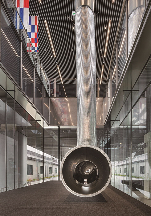 전시를 보고 난 뒤 현대 모터스튜디오 부산에서 F1963으로 이어지는 작은 정원은 또 다른 사색으로 이끌어준다. 이름 모를 야생화들이 가득한 정원은 따듯한 정서와 비움의 미학이 담겨 있어 마치 프랑스 남부 아비뇽에 온 듯한 느낌이 들게 한다. 정원 사이사이, F1963에서 운영하는 아트 라이브러리나 최근에 오픈한 유리 온실 도서관, 큰 규모를 자랑하는 예스24 중고 서점, 최욱 건축가의 미감이 가득한 귀여운 카페 등도 만날 수 있다. 현대모터스튜디오 부산이 위치한 F1963(고려제강의 옛 철강 공장 부지)은 2016년 부산비엔날레 전시장으로 활용된 이후 부산의 상징적인 복합 문화 공간으로 명성을 떨쳐오고 있다. 부산에 사는 예술가들이 매일 아침 이 단지 내의 카페 테라로사에서 커피를 마시며 하루를 시작할 정도로, F1963 자체가 마치 ‘문화의 섬’ 같은 역할을 하고 있다. 서점과 도서관까지 들어와 부산에서 가장 지적이고도 문화적인 명소가 되어가고 있는데, 그 연결선상에서 지은 최욱 건축가의 작품인 현대 모터스튜디오 부산 역시 기업들의 ‘문화적 협업’이라는 큰 상징성을 지니는 존재다. <하늘의 뿌리> 속 코끼리처럼, 인간을 살릴 수도 있는 강력한 상상의 코끼리는 이런 장소에서 커나가는 게 아닐까?