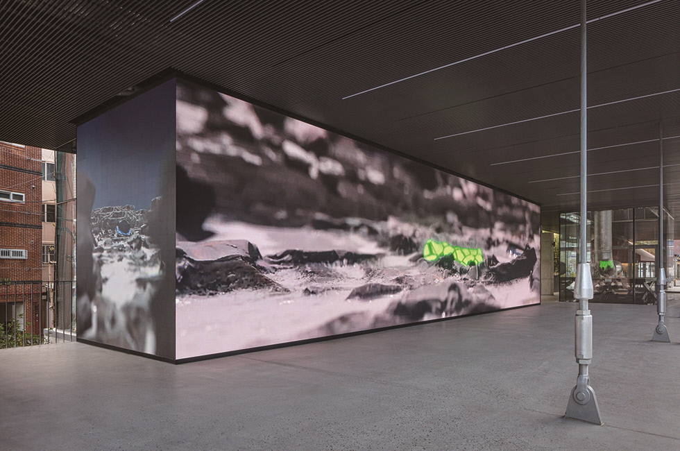 줄리앙 코와네와 심소미가 결성한 그룹 ‘리트레이싱 뷰로’의 작품 ‘아무것도?(Rien?)’는 팬데믹 이후 도시 공간의 위기 속 미래 도시를 향한 불안을 가장 잘 보여준다. 스크린 앞에 설치된 아크릴 패널은 봉쇄된 도시에서 시민으로부터 위협을 느낀 은행이 ATM을 보호하고자 사용한 재료로, 미래 없는 삶에 저항하는 공공과 금융 권력 사이의 긴장을 느끼게 한다. 안성석 작가의 ‘어린이’는 감성적인 톤으로 우리의 불안감을 담았다. 우리 모두 어린이였던 시기를 회상하며 어른의 세계에 담긴 불안과 좌절을 구름의 움직임, 아이들의 웃음 등으로 해소하는 듯하다. ‘2050의 서체’를 상상해본 디자이너 오예슬과 장우석의 작업도 재치 있다. ‘과연 기술이 더 발전할 2050년 무렵엔 우리가 영혼을 담는 말과 글을 더 수월하게 읽고 쓸 수 있을까?’ 하는 고민이 현실적으로 와 닿는다. 블라단 율러의 작품 ‘신채굴주의’는 금방 이해하기 쉽지는 않지만, 필름을 다 보고 나면 가슴 한편이 서늘해진다. 디지털 자본주의나 데이터 자본주의에서 채굴되는 주요 자원은 다름 아닌 우리 자신이라는 사실을 폭로하니 말이다. 그래픽 디자인 스튜디오 오디너리피플, 드로잉 아키텍처 스튜디오도 공간을 수놓는 감각적인 설치 작품으로 참가하는 등 요즘 ‘핫’한 디자이너들의 활약이 전시에 생동감을 더해준다(오는 3월 31일까지).