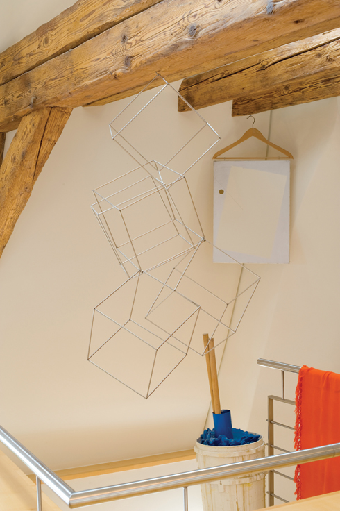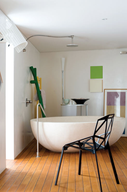 1 욕실 벽에 그린 컬러의 사다리형 오브제 라모(Ramo)를 기대 놓고 수건걸이 대신 사용하고 있다. 이 사다리는 ECAL의 학생인 엠마누엘 자크가 디자인했고, 현재 세라룽가에서 생산하고 있다. 벽에는 올리비에 모세(Olivier Mosset)의 그림 두 점이 걸려 있다. 앞쪽으로는 콘스탄틴 그릭(Konstantin Grcic)의 체어 원이 놓여 있다. 왼쪽으로는 건축가 마리오 보타(Mario Botta)가 디자인한 벽등이 설치되어 있다. 아르테미데 제품.