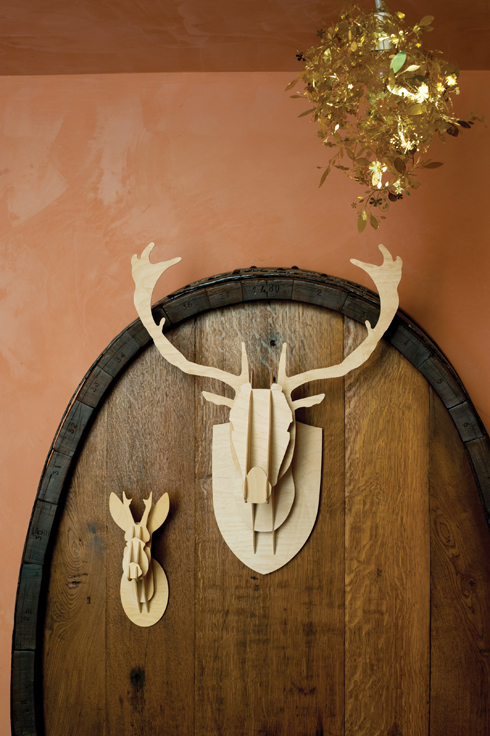 2 알베르토 사르토리스(Alberto Sartoris)가 디자인한 수납장. 아래, 와인 저장고 입구에는 옛날 ECAL의 학생이자 지금은 매우 유명해진 오거스틴 스콧 드 마틴빌의 ‘사냥의 전리품’을 걸어 장식했으며, 현재 블램슈에서 제작하고 있다. 그 위로는 토드 분체(Tord Boontje)의 ‘갈란드 라이트’가 걸려 있다.