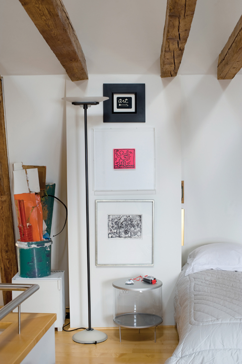 2 침대 왼쪽에 우르스 프라이의 조각과 킹 & 미란다의 플로어 스탠드가 놓여 있다. 벽에 걸린 그림은 위에서부터 벤과 키스 해링, 장 팅겔리의 작품.