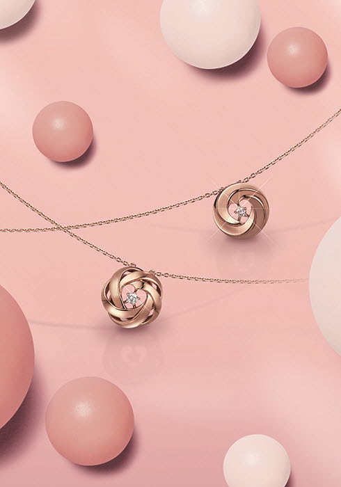 골든듀는 행복함이 활짝 피어나는 설레는 순간을 꽃송이처럼 소담스럽게 표현한 ‘해피블룸 & 해피하트 네크리스’를 선보였다.