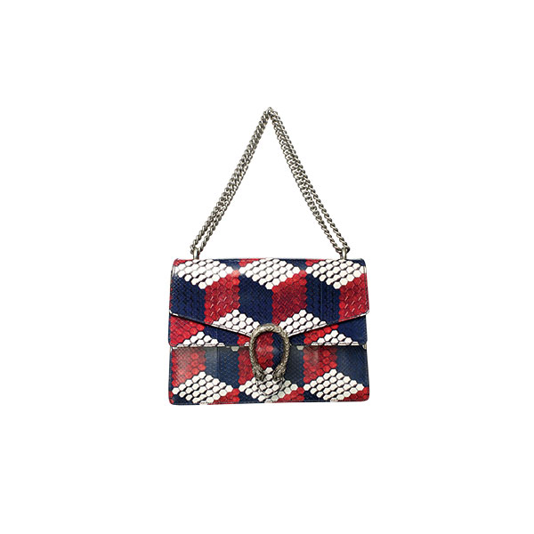 타이거 헤드 장식이 돋보이는 컬러풀한 파이톤 소재의 디오니서스 백.