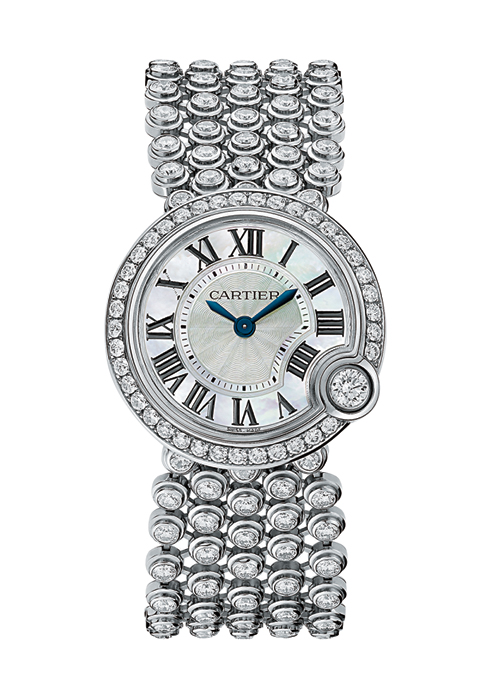 로듐 도금한 18K 화이트 골드 케이스와 자개 다이얼, 검 모양의 블루 핸즈 등 발롱 드 까르띠에의 시그너처 디테일은 그대로 유지하고 다이아몬드를 파베 세팅한 브레이슬릿과 다이아몬드 크라운으로 화려한 아름다움을 표현했다.