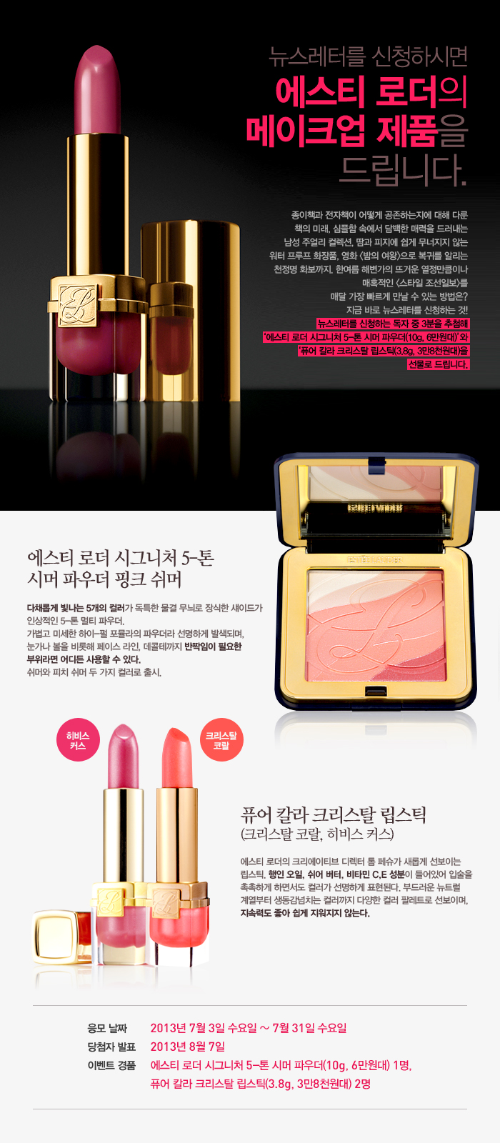 뉴스레터를 신청하면 에스티 로더 메이크업 제품을 선물로 드립니다 작성일자: 7월 03, 2013 글쓴이: stylechosun 조회수: 2700 7월 03, 2013 회원 가입하신 후 뉴스레터 신청을 하시면 이벤트 참여가 이루어지며, 기존 가입자는 뉴스레터 신청 버튼을 눌러 신청하시면 이벤트 참여가 이뤄집니다. 회원 가입시 주소와 연락처(전화번호)를 꼭 남겨주세요. 글 네비게이션 이전글아비노와 함께하는 액티브 내추럴 피부 회복 프로젝트 다음글시세이도 넘버원 자외선 차단제 이벤트 발표