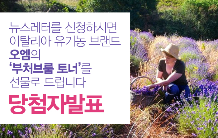 “<당첨자발표> 뉴스레터를 신청하시면 이탈리아 유기농 브랜드 오엠의 부처브룸 토너를 선물로 드립니다.”에 대한 1개의 생각