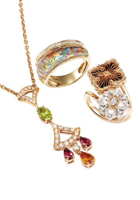 불가리 디바스 드림 유려한 곡선과 다양한 젬스톤으로 컬러풀한 우아함을 선사하는 네크리스. 로즈 골드 소재에 다이아몬드, 시트린 쿼츠, 페리도트, 투르말린을 세팅했다. 1천만원대. 문의 02-2056-0171 스티븐 웹스터 CH2 슬림라인 링 옐로 골드에 오팔과 크리스털 헤이즈 6.09캐럿, 다이아몬드 0.47캐럿을 세팅한 링 1천1백만원. 문의 02-2231-1592 부첼라티 오페라 튤레 콘트라리에 링 핑크와 화이트 골드 소재의 오페라 로고가 마주 보는 모습의 디자인으로, 라운드 브릴리언트 컷 다이아몬드와 오닉스를 매치했다. 7백만원대. 문의 02-3440-5613