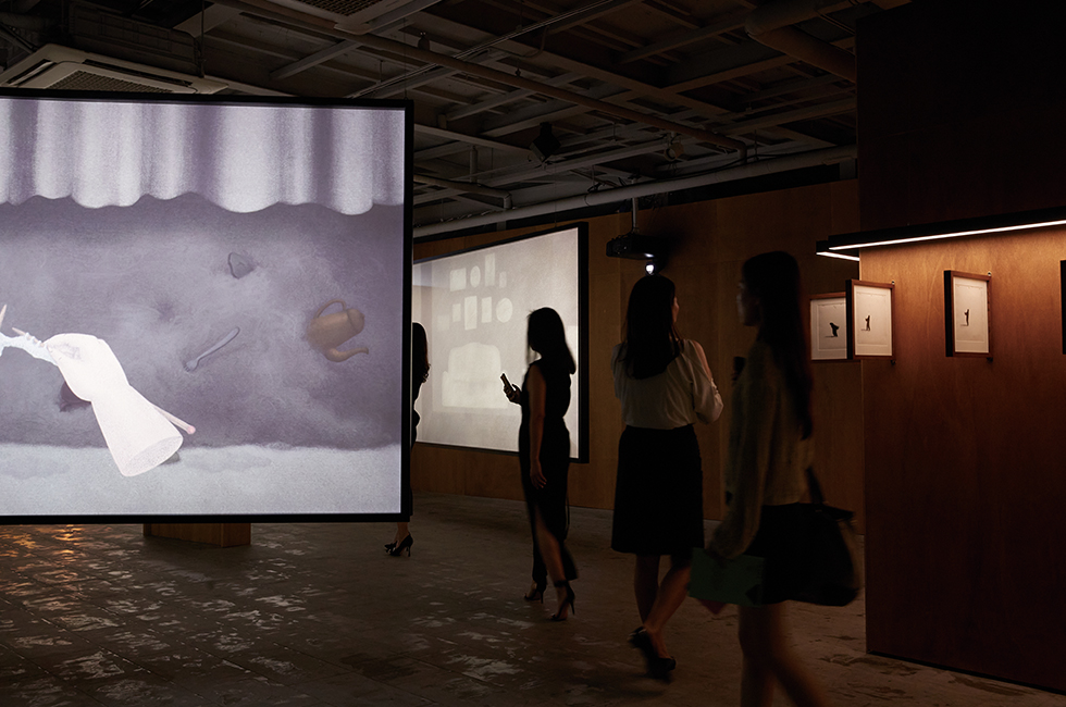 물론 프라다 모드는 현대미술에 오롯이 집중하는 독립성을 갖춘 비영리 재단 활동과는 엄연히 다른 브랜드 차원의 플랫폼이다. 초청받은 소수의 이들이 예술, 음악, 미식, 엔터테인먼트를 아우르는 동시대의 문화를 독특한 방식으로 경험할 수 있는 ‘소셜 클럽’을 정체성으로 내세웠는데, 셀럽들이 포토월에서 촬영을 하고, 프라이빗 디너와 파티, 공연이 벌어진다. 그러나 당연한 얘기일 수도 있겠지만, 콘텐츠를 선정하고 다루는 방식 등 DNA 차원에서 프라다 재단과 비슷한 결이 느껴지기도 한다. 애초에 현대미술가 카르슈텐 횔러(Carsten Höller)가 15년 전쯤 기획한 ‘문화의 장’ 콘셉트를 모태로 하기에 ‘예술’과 ‘협업’이 핵심적인 토대로 녹아들어 있다. 늘 전시가 있고, 융합적 콘텐츠 구성이 있고, 대담을 비롯해 참여적 프로그램이 펼쳐진다. ‘프라다 모드’라는 이름의 첫 행사도 2018년 12월 글로벌 아트 페어인 아트 바젤(마이애미 비치)에서 열렸고, 이후로도 홍콩, 런던 등에서 아트 바젤, 프리즈 같은 미술 행사 기간에 맞춰 진행되는 경우가 많았다. 그리고 키아프와 프리즈가 동시에 열리는 9월 초, 열기 넘치는 아트 주간에 맞춰 처음으로 서울에 상륙했다.이숙경 예술감독과의 협업으로 프라다 모드 서울이 기획한 전시는 <다중과 평행>展. 각자의 영역에서 개성 있는 존재감을 지닌(그리고 여러 세대를 아우르는) 3명의 한국 영화감독과 협업해 영상과 설치 작업 등이 어우러진 전시를 진행했다. 이숙경 예술감독은 “무엇이 한국 문화의 현재를 가장 잘 보여줄 수 있는 매체인지 생각했다”고 밝혔는데, 그 선택은 반가우면서도 전혀 의외는 아니다. 그렇게 해서 김지운, 연상호, 정다희 등 세 감독은 코트의 공간에 저마다의 스토리와 감성을 투영한 전시를 펼쳐냈는데, 영화와는 또 다른 면모가 돋보이기도 했고, 영화만큼이나 세 감독의 결이 다르기도 했다. 김지운 감독은 ‘희미한 옛 사랑의 그림자’라는 설치 작품을 내놓았는데, 주요 소재인 평상이 곳곳에 놓여 있고 그 위에 말린 고추, 꽃무늬 쟁반 등이 올려져 있다. 그리고 공간을 느슨하게 구획하듯 드리운 천 위로 흑백 영상이 흐른다. 김 감독은 “어느새 사라져 보이지 않게 된 것들에 아쉬움을 느끼다가 평상이 떠올랐다”고 설명했다. 연상호 감독은 넷플릭스 시리즈로도 나온 웹툰 <지옥>을 모티브로 삼아 동명의 전시를 선보이면서 주인공이 살던 고시원을 서늘하게 재현했다. 고시원 문을 열고 복도 맨 끝에 다다르면 섬뜩하지만 감독의 예술적 감성을 녹여낸 듯한 설치가 펼쳐진 ‘하이라이트 공간(방)’이 자리했다. 단편 애니메이션을 발표해온 정다희 감독은 ‘종이, 빛, 유령’이라는 제목의 설치 작품을 통해 자신의 영상 작품을 다양한 크기의 스크린으로 보여주면서 드로잉과 조각 등을 활용한 공간을 완성했다. 영화라는 매체를 가능하게 하는 빛의 특성에 주목해 물질인 종이, 조각과 비물질인 빛을 동시에 보여주고자 했다고. 전시 말고도 세 감독이 추천한 영화들을 관람할 수 있는 작은 영화관도 꾸려졌을뿐더러 밤에는 각종 퍼포먼스와 공연이 이어지는 등 깨알 같은 알찬 프로그램이 구비됐다.