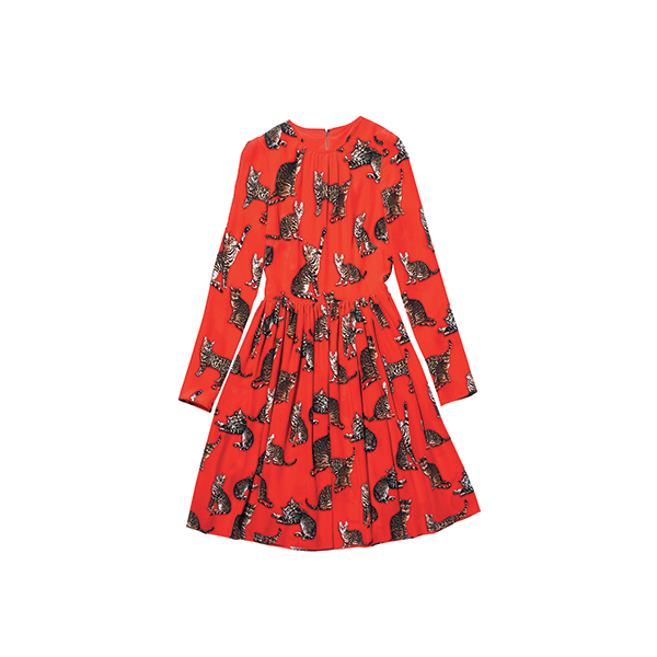 레오퍼드 패턴을 입은 고양이 프린트의 레드 원피스