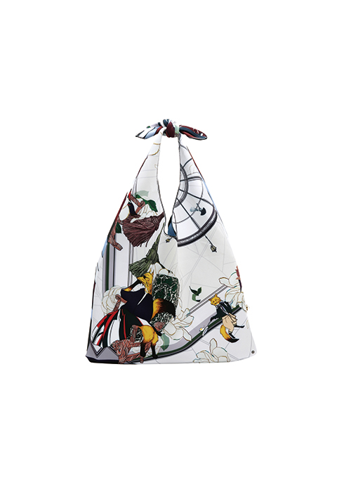 리본을 묶은 듯한 스트랩이 특징인 이 가방은 다채로운 컬러로 패턴을 완성한 앞면과 래트 바이티의 메인 프린트인 꽃과 여우 프린트를 뒷면에 매치해 유니크한 매력을 자아낸다.