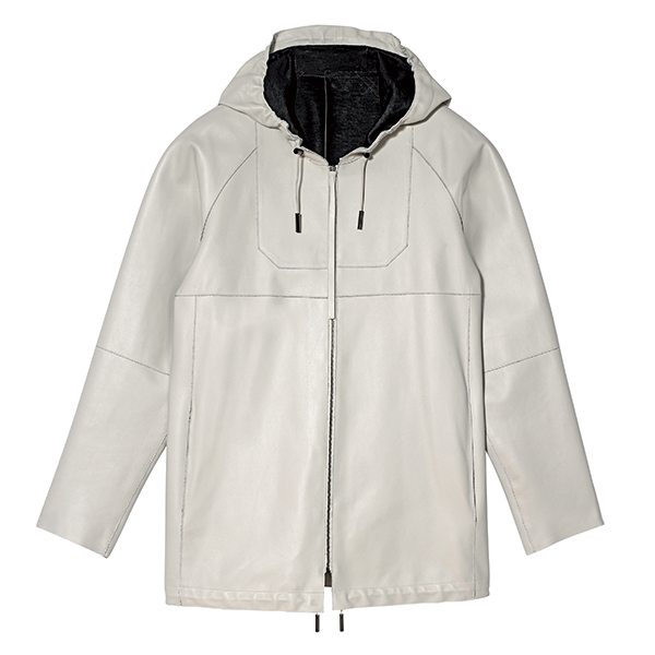 드로스트링 후드를 더한 오버사이즈 레더 재킷