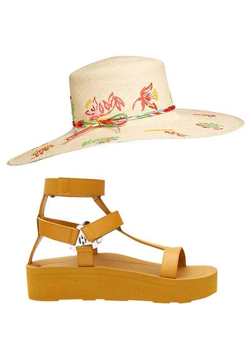 에르메스의 여름 컬렉션은 자연에서 영감을 얻어 그 어느 때보다 싱그럽고 경쾌한 아이템으로 가득하다. 가벼운 소재와 생기 넘치는 컬러, 그리고 플라워 자수 등 대지의 경쾌한 기운을 담아낸 화사하고 여유로운 애티튜드를 부여한다. 여름의 여유를 담은 아이템으로 유쾌한 룩을 연출해보는 건 어떨지. 실크 컬렉션의 모티브가 되는 스파게티 스트랩 장식과 플라워 자수 장식이 유쾌한 파나마 햇 가격 미정, 고트 스킨 샌들 1백30만원대. 문의 02-542-6622