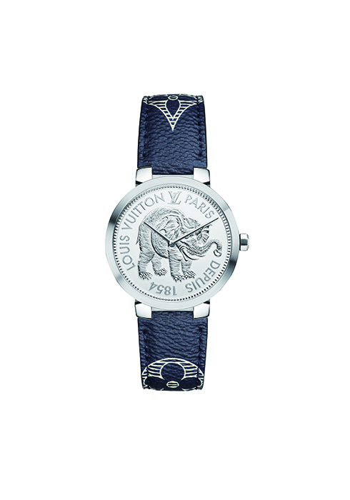 루이 비통은 코끼리 모티브와 모노그램 패턴이 돋보이는 남성용 시계 ‘땅부르 슬림 모노그램 사바나’를 선보인다.