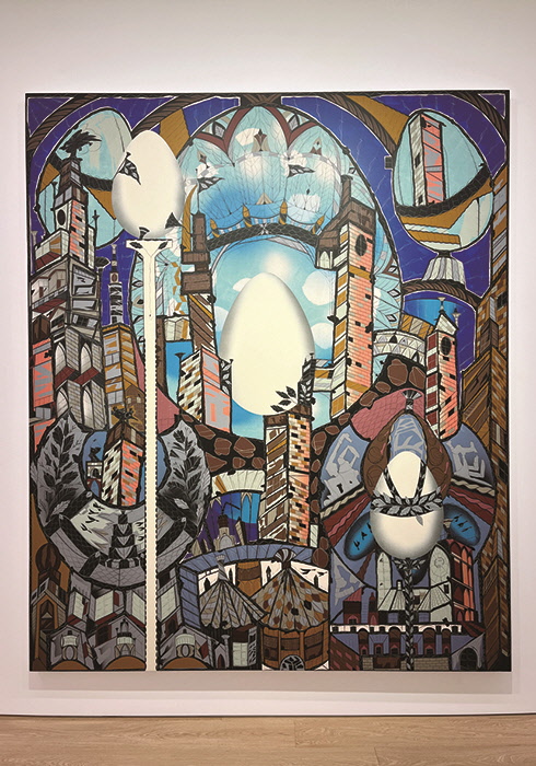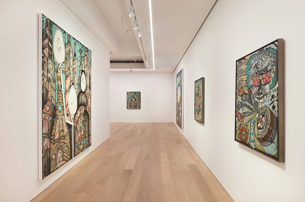 미국 뉴욕을 거점으로 한 탄탄한 브랜드 파워를 기반으로 세계로 확장하고 있는 갤러리 리만머핀이 서울에서 새로운 터전으로 옮겨 새 출발을 알렸다. 안국동에서 작지만 운치 있는 공간을 꾸려온 리만머핀 서울은 지난 3월 15일 이태원역 근처에 1, 2층 공간과 야외 테라스를 갖춘 새 보금자리의 문을 활짝 열었다. 안국동 갤러리는 한국 작가 이불의 손길이 직접 닿은 인테리어가 어린 공간이라 아쉬움도 남지만 이태원의 새 공간은 한층 넓어졌기에(약 231m2, 70평) 보다 규모 있고 다양한 방식의 전시가 가능해졌다는 이점이 있다. 건축 사무소 에스오에이(SoA)가 레노베이션 작업을 맡은 새 갤러리 공간의 첫 전시를 꿰찬 주인공은 미국 로스앤젤레스를 기반으로 활동하는 래리 피트먼(Lari Pitttman). <불투명한, 반투명한, 빛나는(Opaque, Translucent and Luminous)>이라는 제목의 개인전이다. 언뜻 봐도 몹시 정교한 ‘알(egg)’ 같은 상징적 요소와 다채로운 색조, 다양한 관점이 캔버스를 가득 메운 피트먼의 회화 작품은 ‘육안’으로 봤을 때의 시각적 미학이 단연 돋보이는데, 글을 먼저 생각하고 그림을 그린다는 작가가 밑그림도 없고, 조수도 없이 하는 섬세한 작업의 완성도와 구조미가 경탄스럽다. 신작을 내세운 이번 전시의 주제는 ‘대도시에 대한 오마주’라고 한다. 동시다발적으로 펼쳐지는 갖가지 서사가 존재하는 도시의 복잡다단한 모습을 반영한 셈인데, 결코 디스토피아적이지 않고 낙관적인 시선을 품고 있다. 늘 불합리함과 불평등이 자리해왔고, 더구나 팬데믹의 여파로 도시의 일상생활은 상처를 입었지만, 여전히 대도시가 지닌 활력과 역동성을 담아내려는 작가의 의도가 깔려 있는 것이다.