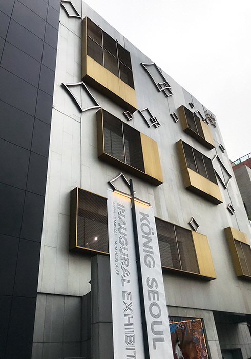 얼마 전 시작한 세 번째 전시의 주인공도 한지를 재해석하는 현대적인 작업으로 알려진 조명 작가 권중모다. 이번 전시를 위해 제작한 ‘이수 에디션’을 비롯해 간결하면서도 서정성이 엿보이는 그의 작품 20여 점을 선보인 <라이트 하우스(Light House)> 전시 말고도 스페이스 이수에 가면 ‘빛의 예술가’로 꼽히는 현대미술 거장 제임스 터렐(James Turrell)의 영구 설치 작품과 메리 코스(Mary Corse)의 회화 작품 등도 만날 수 있음을 기억해둘 필요가 있다. ‘독일’이라는 공통분모를 바탕으로 현대미술 화랑을 플래그십 매장에 들여놓은 MCM의 사례도 흥미롭다. 1976년 독일 뮌헨에서 탄생했지만 한국 기업이 인수해 키운 글로벌 패션 브랜드 MCM은 베를린을 주 무대로 글로벌 시장으로 뻗어나가고 있는 쾨닉(Ko··nig)과 손잡고 청담동 플래그십 매장에 서울 지점을 개관했다. 로열층인 5층과 ‘조각 정원’이 있는 옥상까지 섭렵한 쾨닉 서울에 가려면 MCM 매장을 통과해야 한다. 예술 후원이라는 취지도 잡고, 모객 효과를 기대할 수 있다지만 나름 ‘통 큰’ 행보가 아닐 수 없다. MCM 하우스 바로 옆에 자리한 명품 브랜드 헨리 베글린도 최근 매장 건물에 미 스페이스(ME space)라는 갤러리를 열어 <세 개의 시선>이라는 개관전을 펼쳤고, 로데오 거리에 위치한 다른 건물에도 L. 993이라는 전시 공간을 열었다.