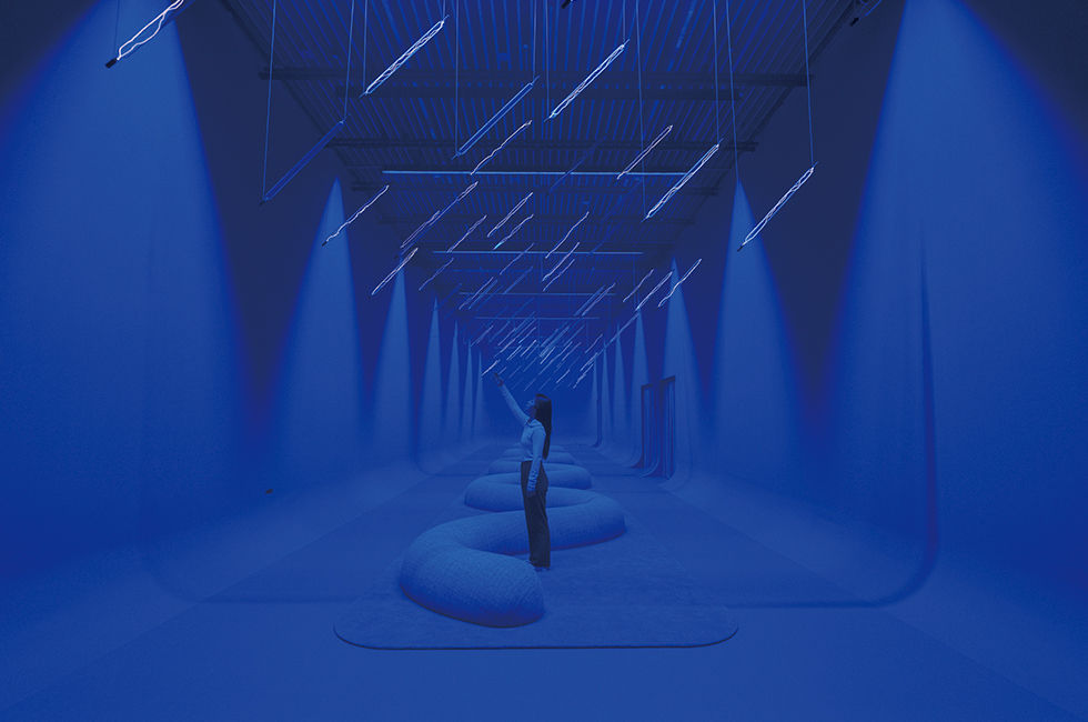 전시의 마지막 하이트라이트는 듀오 디자인 그룹인 스튜디 오 스와인(Studio Swine)이 현대자동차의 모빌리티 비전 에서 영감받아 만든 설치 작품 ‘흐르는 들판 아래’가 마치 춤 추는 회화처럼 펼쳐지는 공간이다(작품에 현대자동차 ‘세븐’ 의 친환경 소재를 사용하기도 했다). 자연의 아름다운 순간 을 전기에너지와 함께 기술로 재현한 이 작품은 물질의 제 4 상태로 일컬어지는 ‘플라스마(고체, 액체, 기체와는 다 른 물질 상태)’를 활용했으며, 작가가 스스로 ‘에퍼머랄 테크 (Ephemeral Tech)’라 명명한 기술(자연현상을 목격하는 것과 기술을 통해 가까운 감각을 재현하는 것)과 섬세한 작 품관을 감각적으로 반영했다. 현재로서는 인류의 유일한 셸 터인 지구를 상장해 푸른빛을 머금은 이 공간은 진공 상태의 네온 튜브에서 들리는 소리와 함께 별빛이 무리 지어 이동하 는 듯하면서도 푸른 새벽 들판 위 쏟아지는 빗줄기를 연상시 킨다. “연기도 있고 불빛도 있고 의자도 있지만, 우주를 유 영하는 듯한 환상적인 느낌이 들 겁니다. 우주에 있다 보면 시간과 공간감을 완전히 상실하죠. 건축가 버크민스터 풀러 가 지구를 ‘차가운 진공의 공간을 통과하는 지구라는 이름의 모빌리티’라고 언급했듯 사실 지구는 우주를 유영하는 셸터 기도 하고요.” 과학자와 예술가를 오가며 사유하는 듯한 스 튜디오 스와인의 알렉산더 그로브스(Alexander Groves) 는 “요즘엔 태양계를 벗어나 이동하는 모빌리티를 생각하고 있어요. 빛의 속도를 따라잡아야 하는데, 그걸 가능하게 하 는 이론을 읽고 있는 중이죠”라고 덧붙였다.