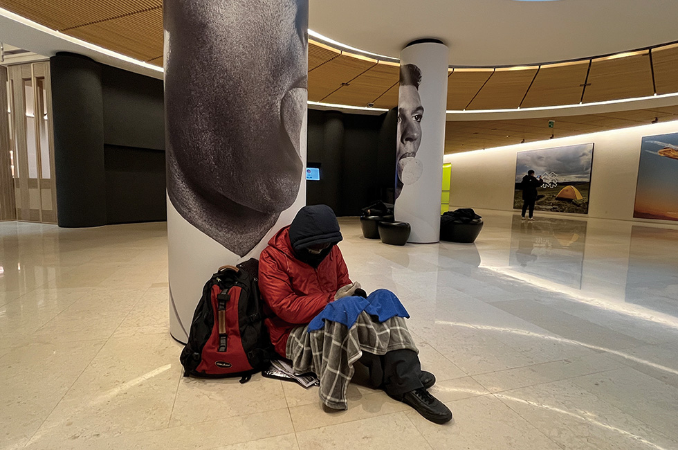 6 리움미술관에서 진행 중인 이탈리아 출신의 세계적인 개념 미술가 마우리치오 카텔란의 <WE> 전시 풍경(로비). 로비 기둥을 감싸고 있는 이미지(무제, 2000)는 2000년 미술 잡지 <파르켓(Parkett)>에서 처음 선보였는데(디지털 프린트), 흰 셔츠와 넥타이를 단정하게 맨, 어쩐지 이미 원칙을 중시하고 순응적일 듯한 남성의 입에 코르크 마개가 물려져 있다. 기둥 앞에 놓인 얼굴 없는 ‘노숙자’ 시리즈의 작품명은 ‘동훈과 준호’(2023). 우리 사회에서 소외된 노숙자를 직면하도록 하는 동시에 미술관에 들어오기에 적합한 사람에 대한 선입견에 도전한다.