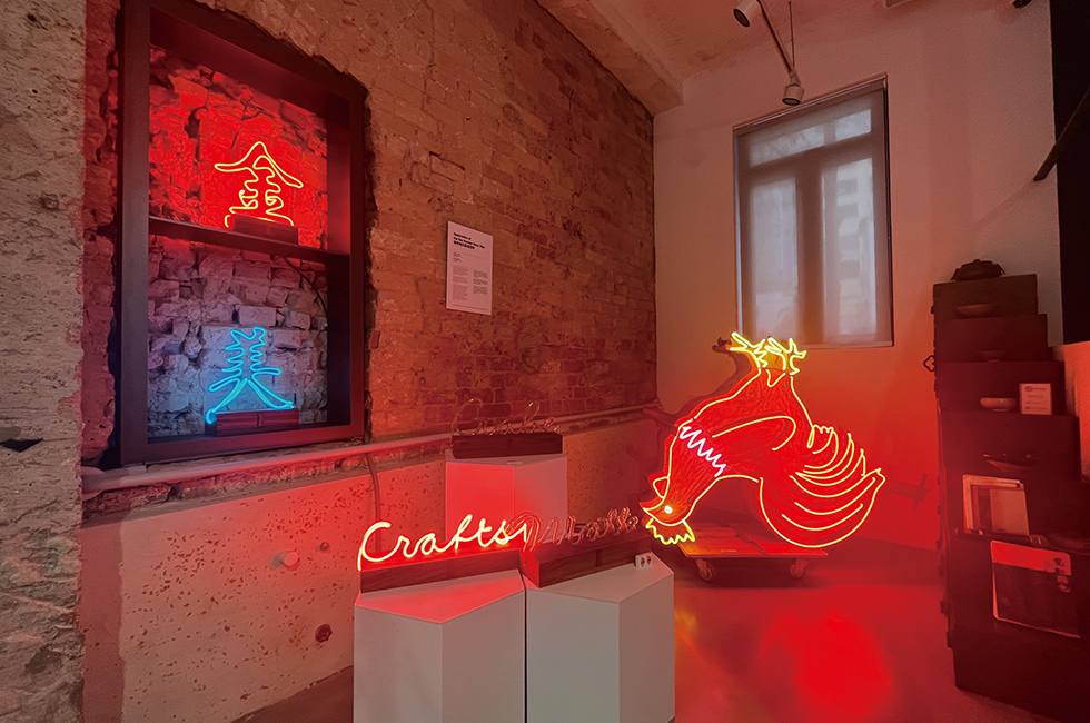 14 공예 작가들을 지원하는 홍콩의 비영리 전시 공간이자 워크숍 크래프트 온 필(Craft on Peel)의 내부 모습. ‘마작’ 장소를 은유하는 사인(작품)이 보인다.
