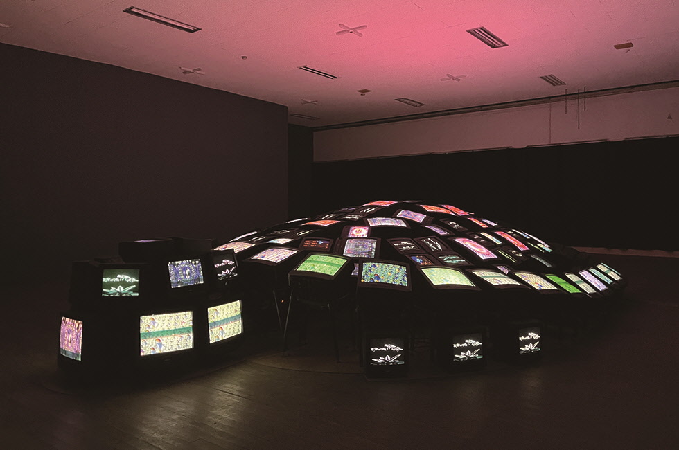 일단 백남준의 1993년 작품인 ‘거북’은 울산시립미술관 1호 소장품으로, 1백66대의 TV 모니터를 거북 형상으로 만든 대형 비디오 조각 작품(6 x 10 x 1.5m)이다. 암막 커튼을 드리워 빛을 완전히 차단한 전시장에 엎드려 있는 커다란 전자 거북을 ‘모시기에’ 파도 일렁이는 바닷가의 단독 공간이야말로 더할 나위 없는 자리가 아닐까 싶다. 깜깜한 곳이지만 거북의 머리는 분명 바다를 향하고 있다. 이렇듯 소장품 1호다운 무게감을 유감없이 발휘하는 백남준의 ‘거북’을 위시해 대왕암 폐교에서는 29팀의 작가를 소개하는 소장품 전시 <찬란한 날들>이 오는 4월 10일까지 계속된다.