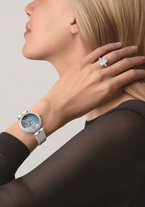 로즈 컷 다이아몬드로 묘사한 요정의 얼굴이 돋보이는 뉴 페어리 워치. 최초로 플리크 아 주르 에나멜과 그리자유 에나멜을 함께 사용해 날개 부분의 음영을 만들고 셀프 와인딩 메캐니컬 무브먼트를 정교하게 조립해 완성했다. 부드러운 원형 사파이어 글라스 케이스는 전체 워치 실루엣을 부드럽게 마무리한다.
