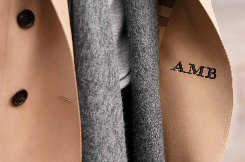 1879년 토머스 버버리가 발명한 개버딘 트렌치코트에 장인들이 수작업으로 이니셜을 새기는 서비스로 나만의 트렌치코트를 완성할 수 있다.