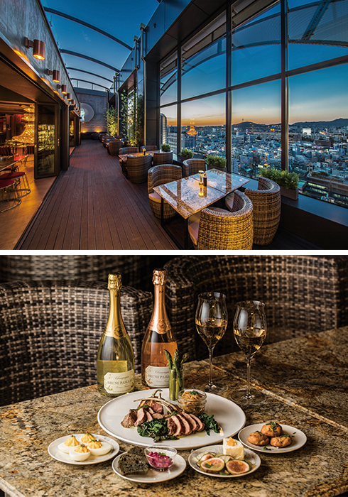 미식 문화가 갈수록 풍요롭고 다채로워지고 있는 요즘,19세기 말에서 20세기 초 예술적 낭만이 파리를 수놓은 문화적 황금기를 일컫는 ‘벨 에포크’ 시대의 낭만을 현대적으로 풀어낸 듯한 색다른 공간이 등장해 주목된다. 서울 에이든 청담 호텔 18층에 문을 연 샴페인 라운지 ‘르 캬바레 도산(Le Cabaret Dosan)’이다. 벨 에포크 시대에 성인을 위한 미식과 사교의 장이던 카바레 문화를 새롭게 해석했다는 이 라운지는 ‘샴페인 페어링(champagne pairing)’이 미식에서 점점 더 두각을 나타내는 하나의 문화로 자리 잡아가고 있는 시기에 생긴 만큼 참신한 맛과 멋의 앙상블을 추구하는 이들의 눈길을 끌 듯하다. 남산과 한강을 동시에 볼 수 있는 시원한 전망을 품은 데다 개폐식 돔형 지붕까지 있어 밤하늘의 운치를 느낄 수 있으며, 시선을 절로 잡아끄는 커다란 샹들리에와 상큼한 꽃으로 가득 찬 샴페인 셀러가 분위기를 북돋우는 인테리어, 감미롭거나 ‘힙한’ 음악 등 샴페인을 곁들인 미식을 세련되면서도 낭만적인 분위기에서 즐기도록 세심히 신경 쓴 흔적이 보인다. 미각을 담당하는 주인공은 프렌치 레스토랑 프렙의 오너 셰프 출신인 이영라 셰프와 소믈리에 양대훈 매니저. 특이하게도, 코스가 아닌 일곱 가지 요리를 한꺼번에 즐길 수 있는 ‘한 상 차림’으로 샴페인과 페어링되는데, 절기에 맞는 음식과 최적의 샴페인을 짝지어 셰프가 알아서 내주는 오마카세 방식을 택했다(제철 식재료를 기본으로, 3주마다 메뉴가 바뀐다). 한마디로 ‘프렌치 오마카세 메뉴’인 셈이다. 영업 시간은 평일 오후 6시~새벽 1시, 금·토요일  오후 6시~새벽 2시. 문의 02-6713-6730(오후 5시부터)
