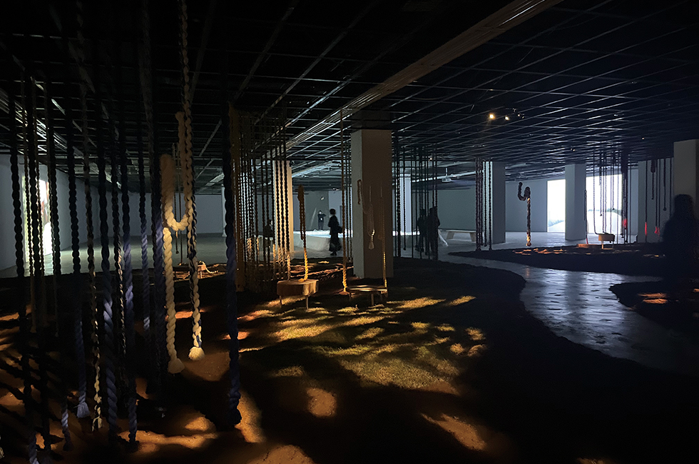 전시관 진입부를 따라 들어서면 어두운 바닥의 흙 사이로 오솔길이 나 있다. 부드러운 실을 엮어 만든 밧줄과 나무 둥치에 서린 은은한 빛을 따라 걷다 보면, 제의적 노래 부르기에 가까운 사운드에 맞춰 춤을 추는 듯한 여성들의 영상을 마주하게 된다. 불레베즈웨 시와니(Buhlebezwe Siwani)가 꾸린 이 공간은 인류 역사의 다양한 문화권에서 발현된 ‘어머니 자연’, ‘어머니 여신’의 믿음을 떠올리게 한다. 요하네스버그 출생으로 전통적인 치유자 ‘상고마’로 훈련받기도 한 작가는 아프리카 신화와 현실을 중심으로 영혼과 영적인 것에 관한 작품을 만들어왔다. 장소 특정적 설치 ‘바침’은 초자연적 존재가 깃든 신비로운 대자연을 구현한다. 3채널 영상 작업 <영혼 강림>은 이러한 존재들을 상상하며 현 사회 속 흑인의 몸을 다각적으로 비춘다. 특히 수조 아래 설치된 영상은 노예무역 중 수장된 수많은 아프리카인을 떠올리게 하는데, 한 무리의 여성이 해안가에서 제의 형태의 군무를 행할 때 그 울림은 배가되는 듯하다. 두 작품은 대지와 물, 인간과 자연, 소환과 회복의 다층적 이야기를 영적인 틀로 묶어낸다. ‘들어서며’의 공간에 펼쳐진 두 작품의 풍부한 시각적 단서는 비엔날레가 아우르는 네 가지 소주제로 파동한다.