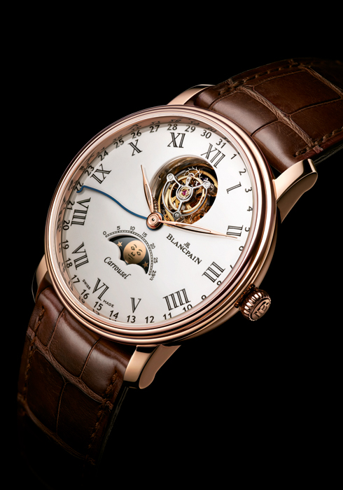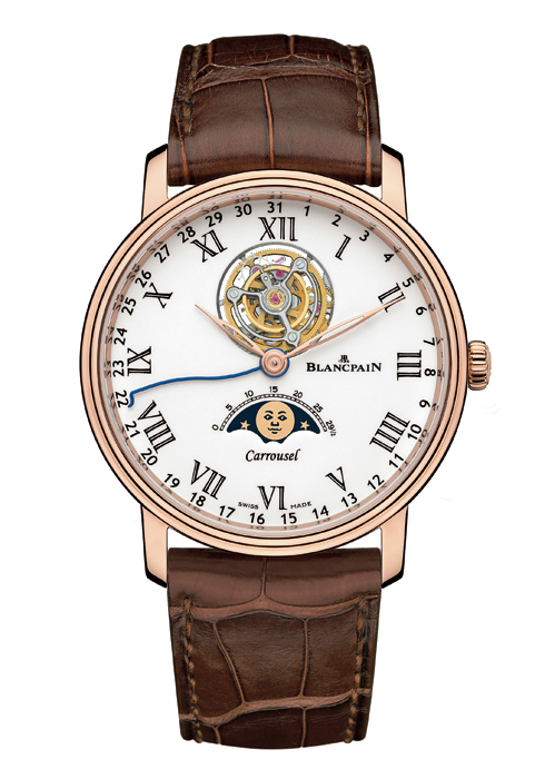 외형상 클래식할 뿐 아니라 가장 클래식한 시계 기술 중 하나인 까루셀을 장착한 블랑팡의 새로운 빌레레 컬렉션. 블랑팡 고유의 블루 웨이브 핸즈가 더욱 빛을 발하는 다이얼 디자인이 특징이다.
