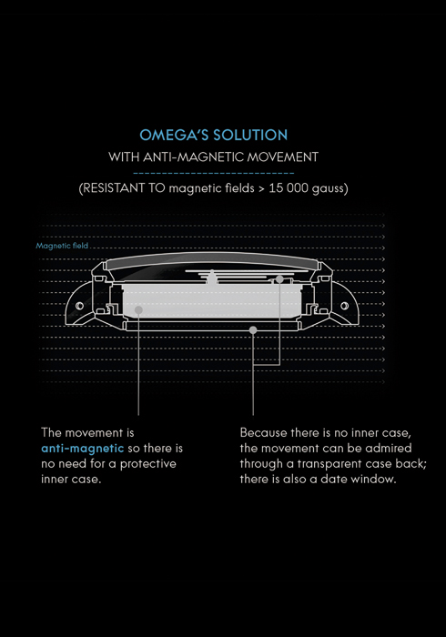 기술적 진보를 담은 다양한 컬렉션을 선보이며 바젤월드의 중심축을 이루고 있는 오메가. 올해는 지난해 선보인 아쿠아테라 15000가우스 워치에 장착해 선보인 항자성(anit-magnetic) 무브먼트인 마스터 코-액시얼 무브먼트를 모든 신제품 시계에 적용하는 놀라운 성과를 이루었다. 이전 코-액시얼 칼리버와 비교해 15000가우스 이상의 자성을 견딜 수 있는 능력을 갖춘 새로운 무브먼트를 빠르게 산업화해 상용화한 것은 대형 브랜드의 노하우와 저력 덕분이라 할 수 있다. 아무리 좋은 기술을 개발해도 상용화되지 못한다면 무용지물이기에 보다 현실적으로 대중이 놀라운 기술을 누릴 수 있도록 빠르게 움직인 것이다. 1999년 선보인 코-액시얼 무브먼트만으로도 가히 혁명적이라 인정받았는데 여기에 항자성 무브먼트 기능까지 더해 타의 추종을 불허하는 완벽한 무브먼트의 가능성을 열였다. 이 특별한 무브먼트 패밀리는 마스터 코-액시얼 칼리버 8400/8401, 8500, 8511, 8520로 기존에 자성으로부터 보호하는 방식과 달리 케이스 내부에 특별한 보호 장치 없이 무브먼트 자체에 반자성 성질을 지닌 소재를 사용했다.2008년 선보인 Si14 소재의 실리콘 밸런스 스프링이 이 무브먼트의 완성도를 높이는 데 결정적 역할을 했다. 마스터 코-액시얼 무브먼트를 장착한 모든 시계에 4년간 품질을 보증한다는 것만으로도 새로운 무브먼트의 안정성을 확인할 수 있다.