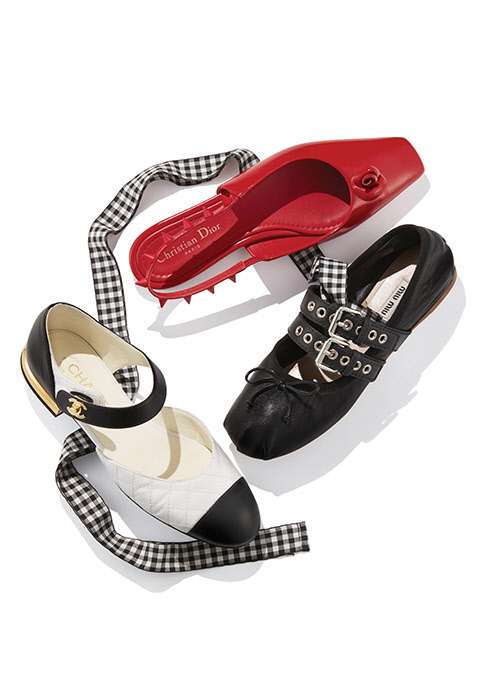 펑키한 벨트 장식과 사랑스러운 리본 스트랩으로 상징되는 시그너처 발레리나 슈즈 1백7만원 미우미우. 문의 02-3218-5320.
