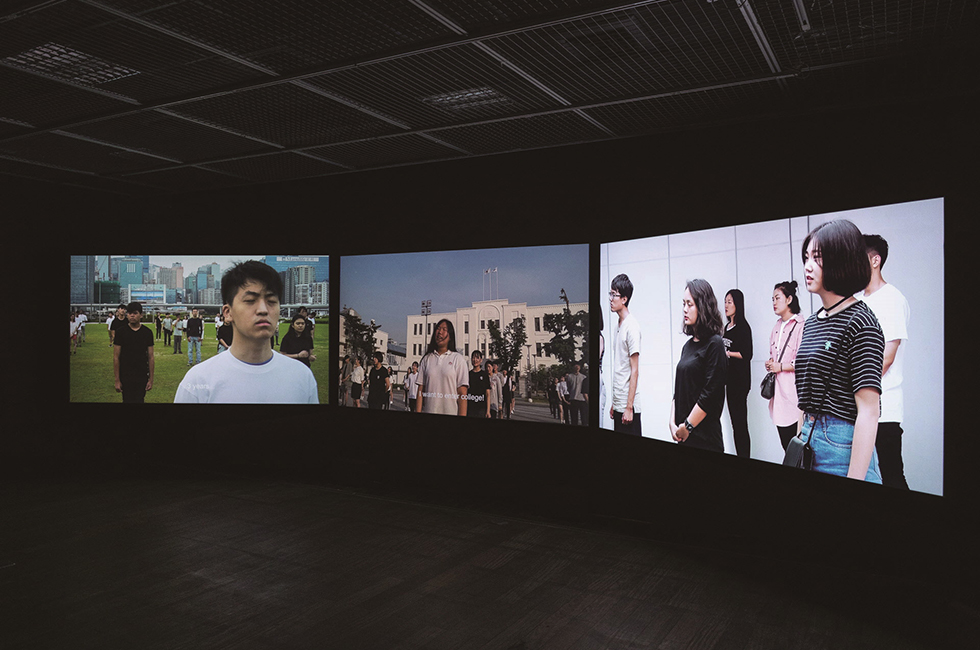 4 현재 MOCA 타이베이에서는 소리(sound)를 둘러싼 정치, 사회, 문화적 고찰을 담은 전시 이 열리고 있다. 홍콩, 광주(한국), 우한, 세 도시 주민들이 나와 저마다 그리는 미래의 비전을 외치는 모습이 담긴 홍콩 아티스트 아이작 충 와이(Isaac Chong Wai)의 3채널 영상 작품 ‘One Sound of the Futures’(2016).