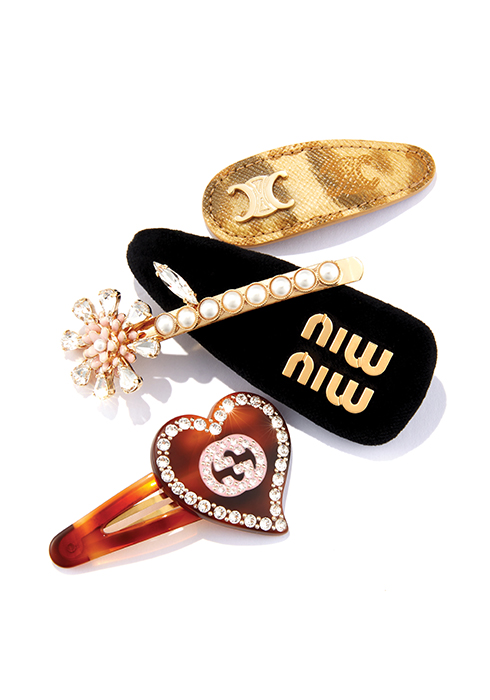 단조로운 헤어스타일에 포인트를 더할 헤어 클립 4. (위부터 차례대로) 부드러운 송아지가죽 소재에 골드 컬러의 셀린느 로고와 독특한 프린팅을 더한 트리옹프 스냅 헤어 클립 57만원 셀린느 바이 에디슬리먼. 문의 1577-8841. 아이코닉한 미우미우 로고가 돋보이는 블랙 컬러의 벨벳 소재 헤어 클립 가격 미정 미우미우. 문의 02-541-7443. 은은한 골드 컬러 메탈에 크리스털 아플리케와 비즈 장식으로 꽃 모티브를 완성한 비비에 블로썸 헤어 클립 69만원 로저 비비에. 문의 02-3479-6115. 하트 디테일 속 인터로킹 GG 로고 셰이프에 반짝이는 크리스털을 더한 레진 소재 헤어 클립 57만원대 구찌. 문의 02-3452-1521
