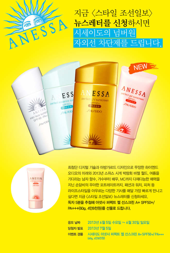 시세이도 넘버원 자외선 차단제를 드립니다. 작성일자: 6월 05, 2013 글쓴이: stylechosun 조회수: 2535 6월 05, 2013 회원 가입하신 후 뉴스레터 신청을 하시면 이벤트 참여가 이루어지며, 기존 가입자는 뉴스레터 신청 버튼을 눌러 신청하시면 이벤트 참여가 이뤄집니다. 회원 가입시 주소와 연락처(전화번호)를 꼭 남겨주세요. 글 네비게이션 이전글스타일 조선일보 독자 6분에게 다미아니 러브 브레이슬릿을 드립니다. 다음글스카이워치 론칭 이벤트