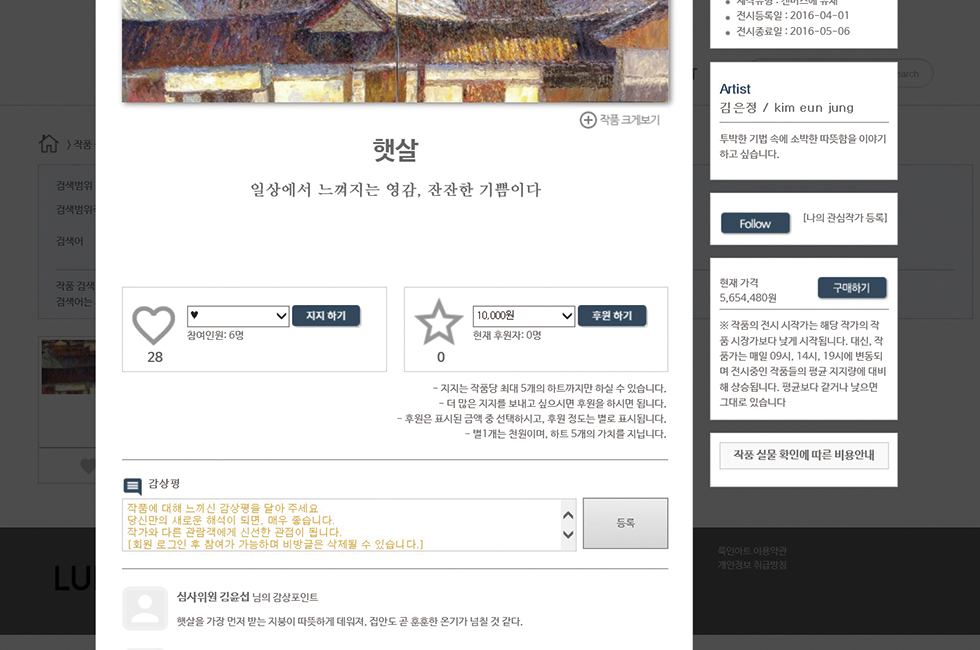 한국에서도 의미심장한 조짐이 조금씩 나타나고 있다. 어포더블 아트를 내세운 개성 있는 온라인 플랫폼이 하나둘 생겨나고 있는 추세다. 해외에서는 단색화 열풍이 불고 있다지만 전반적으로 한국 미술 시장은 주춤한 게 사실이다. 이런 가운데 새로운 수요를 이끌어낼 수 있는 디지털 플랫폼의 등장은 미술 시장의 저변을 확대한다는 차원에서도 반가운 행보가 아닐 수 없다. 이 같은 맥락에서 얼마 전 문을 연 룩인아트(www.lukinart.com)는 자못 기대가 되는 이색 온라인 갤러리다. 신진 작가들의 작품을 세상 어디에도 없는 독특한 방식으로 대중에 소개한다고 주장하는 갤러리답게 그 면면이 꽤나 흥미롭다. 일단 작품가를 산정하는 방식이 여느 갤러리들과 다르다. 일방적으로 작품가를 제시하는 대신 작품을 감상하는 대중의 ‘여론’에 따라 호당 단가를 정하기 때문이다. 예컨대 룩인아트에서 개최하는 온라인 전시에 출품한 신인 작가의 작품이 마음에 든다고 치자. 관람객은 페이스북의 ‘좋아요’처럼 하트 표시를 눌러 정서적인 ‘지지’를 보내거나, 별 표시를 눌러 ‘후원’을 할 수 있다(1천원 단위에서 출발한다). 물론 신인의 기준가는 있지만(대개 호당 4만~8만원) 전시 중에 얻은 상대적 지지도를 반영해 다음 전시 작품의 가격을 정하는 것이다. 여론이 척도가 되므로 작품가에 공감할 수 있고, 관객은 좋아하는 작품을 지지하며 후원해줄 수 있으므로 일석이조인 셈이다.