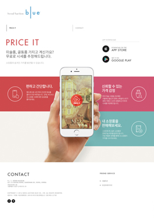 올해 서울옥션은 온라인 시장에서 새로운 전환점을 맞이하게 될 듯하다. 최근 ‘블루(Blue)’라는 명칭의 온라인 플랫폼(http://seoulauctionblue.com)을 새로 선보이고 동명의 자회사도 설립했기 때문이다. 올 하반기에는 이비드 나우를 통합해 단독 온라인 플랫폼 역할을 할 예정인 블루가 야심 차게 선보인 첫 서비스 ‘프라이스 잇(Price It)’을 보면 아직은 발아기 단계인 온라인 경매 시장을 선점하기 위한 서울옥션의 열정이 꽤나 뜨겁다는 사실을 알 수 있다. 프라이스 잇은 그림이나 골동품 등 집에 있는 소장품의 가치를 의뢰하면 손쉽게 알려주는 모바일 앱으로, 심지어 무료로 제공되는 서비스다. 1분 정도 시간을 투자해 휴대폰으로 사진을 찍어 올리고 작품 정보를 간단하게 입력하면 ‘접수 완료’다. 며칠 내로 전문가들이 추정가를 알려주는데, 원하면 나중에 경매품으로 위탁할 수도 있다. 누구나 집에 가격을 알 수 없는 소장품이 하나둘은 있다는 점을 감안할 때 꽤나 구미가 당기는 서비스다.
