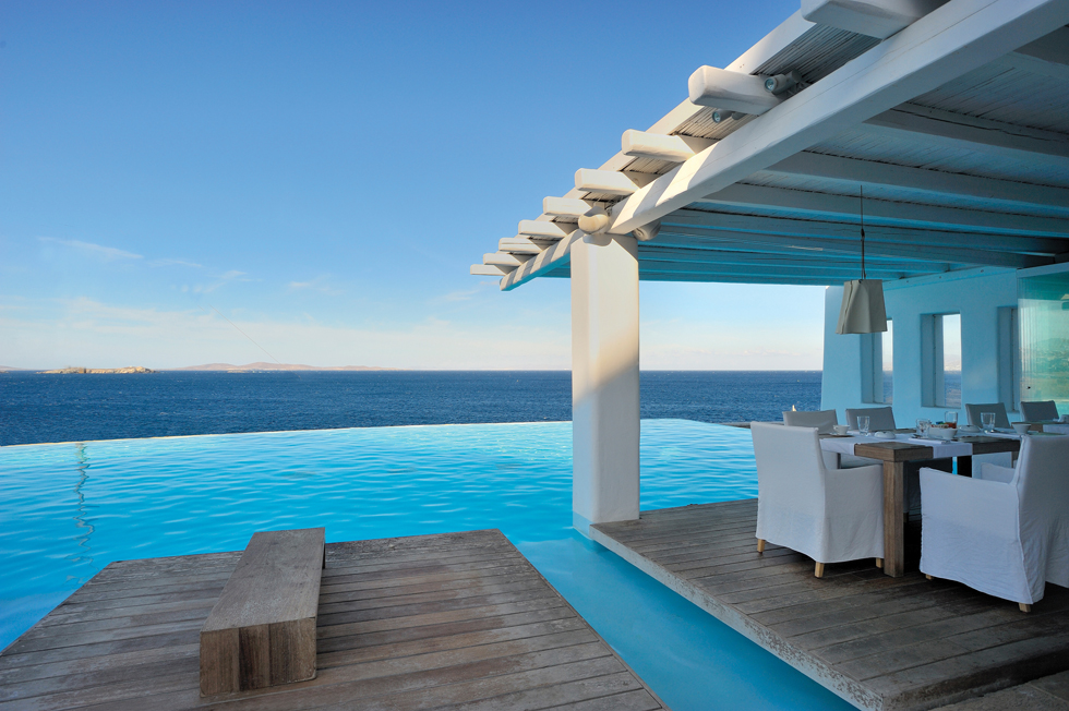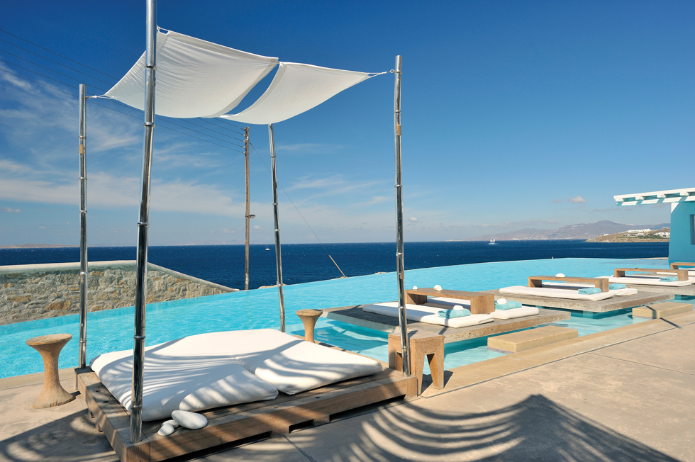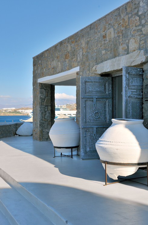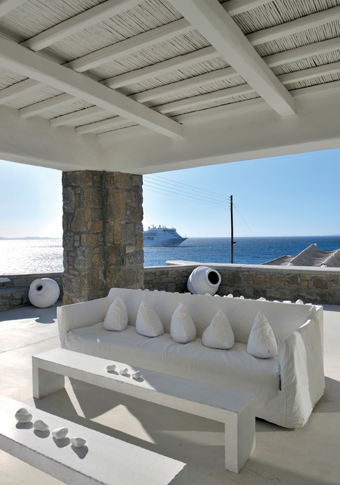 고급스러움과 조용함, 풍요로움이 선사하는 뜻하지 않은 즐거움 덕분에 당신은 이 그림엽서 같은 곳에 정착하고 싶은 마음이 들지도 모른다. 이곳에 있다는 것 자체만으로도 마음은 즉각적으로 안정을 되찾는다. 또 도시의 복잡함에서 벗어나 빈둥거리며 지내기 위해 이곳으로 여행 오기로 결정한 것이 옳은 선택임을 확신하게 된다. 이곳에서 보내는 나날은 끝없이 이어지는 허니문 같다. 스파에서 정성스러운 마사지를 받으며 원기를 얻고, 그늘과 태양을 오가며 낮잠을 즐기고, 목이 마르면 언제든 과일 칵테일을 한잔하고, 저녁에는 흔들리는 촛불 아래서 디너를 즐기면 된다. 이 마법 같은 순간들은 절벽 아래쪽으로 해안을 따라 나 있는 도로에 스쿠터들이 복잡하게 줄지어 서 있다는 현실을 잊게 만든다. 미니멀리즘보다 더 순수한 데커레이션은 돌과 나무, 갈대, 회벽 같은 거친 자연 소재 덕에 더욱 돋보인다. 결점이란 찾아볼 수 없다. 이곳에 놓인 소파와 의자, 세라믹 화기는 파올라 나보네가 제르바소니를 위해 디자인한 것이고, 오일 담는 항아리는 이 지역 전통 제품이다. 침실에서는 지중해 특유의 컬러를 찾아볼 수 있다. 또 이곳저곳에 부분적으로 사용된 골드 컬러는 빛으로 가득한 공간에 악센트를 더한다. 모든 객실에는 바다를 향한 근사한 전망을 자랑하는 테라스가 딸려 있고 스위트룸에는 개인 풀이 따로 갖추어져 있다. 각 객실에서는 완벽한 프라이버시를 즐길 수 있다. 당신 옆방에 머물고 있는 이들은 막 결혼한 젊은 일본인 커플일 수도, 미국인 가족일 수도, 얼큰하게 취한 잘생긴 이탈리아 젊은이들일 수도, 주말을 즐기러 온 그리스 인일 수도 있다. 호텔의 전반적인 분위기는 코즈모폴리턴적이며 우아하고 이곳의 구성은 진정으로 휴식을 취할 수 있도록 배려된 것이다. 호텔에서 600m 아래에 펼쳐지는 미코노스 섬의 풍경은 해변과 나란히 이어지는 골목길, 각 문에 달린 고급스러운 간판들로 아기자기하다. 이 소소한 것들만으로도 기분 전환하기에는 충분하지 않겠는가.